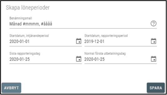 I standardleveransen finns perioder för månadsutbetalning, där månadslönen avser innevarande månad, upplagt. Dessa perioder har beteckning “ÅÅÅÅ.M.MM”. I listan ser du datum för de 12 perioderna.