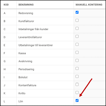 • På kod L Lön markerar du Manuell kontering.