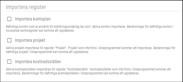 • Välj vilka register du vill importera från Fortnox. Läs informationen om vad som gäller för respektive val, markera det du vill importera och [Importera]