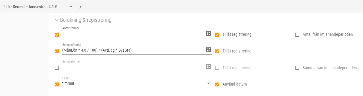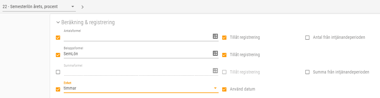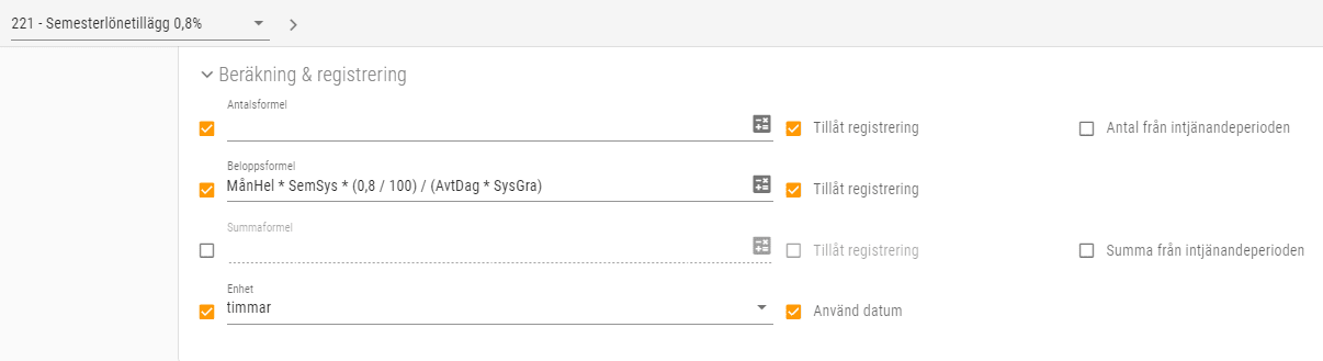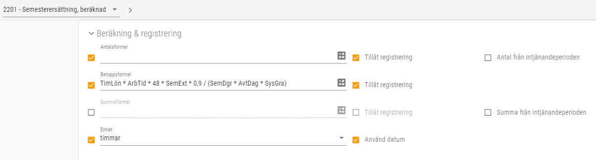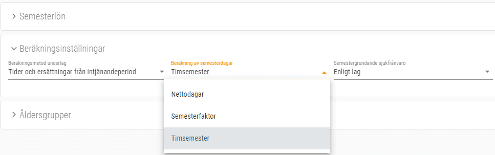 Här väljer du beräkningsinställning Timsemester och Sparar semesteravalet.