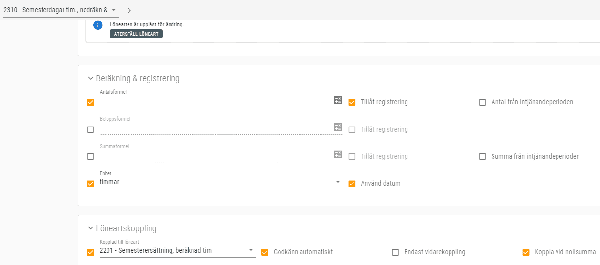 Förutom att tilldela de anställda ett antal semestertimmar så behöver vi också beräkna vad varje semestertimme ska vara värd och betala ut rätt semesterlön/tillägg per uttagen semestertimme. Vanliga lönearter vid utbetalning av semester är i standardtabellen 22, 221, 223 och 225. I LSS-tabellen används ofta lönearterna 2310 och 2201 för timavlönade. Vi visar här vilka formler och andra ändringar som behövs på några av de här lönearterna. Har ni gjort egna lönearter, så se över dem också och kontrollera om något behöver ändras även där. Lite längre ner på sidan kommer en förteckning över några använda formelkoder och förklaring av innebörden. Kopiera gärna dem och klistra in i era egna löneartstabeller. Det är viktigt att alltid stämma av med sitt eget avtal innan man ändrar några formler. Här presenteras enbart förslag på formler som kan användas. Kom ihåg att ändra både Beloppsformel och Enhet om inte beloppsformeln är SemLön eller SpaLön eftersom beloppet då oftast redan är uträknat i beredningen. Spara lönearterna efter ändring och markera även Lås för att ej skrivas över vid import på varje ändrad löneart.
