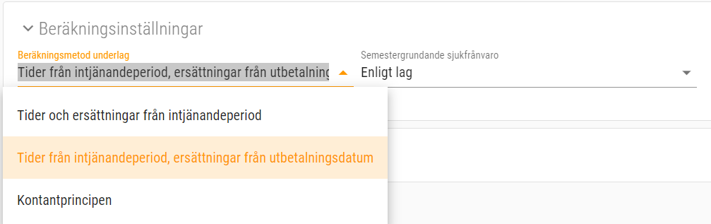 I löneprogrammet finns olika beräkningsinställningar på semesteravtalen. På varje avtal kan man välja mellan Tider och ersättningar från intjänandeperiod, tider från intjänandeperiod, ersättningar från utbetalningsdatum eller Kontantprincipen. Här kan du läsa mer om de olika metoderna: https://crona.se/supportdokumentblogg-web/web0020