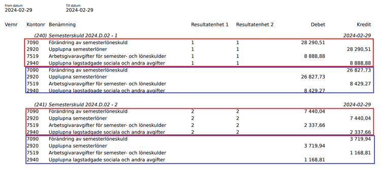 Konteringen som är inom röd markering visar aktuell semesterskuld per 2024-02-29 inklusive resultatenheter. Inom blå markering ser vi bokföringsunderlaget från januari som saknade resultatenheter. Det är nu är vänt så att det nya bokföringsunderlaget enbart innehåller skillnaden mellan januari och februari månads semesterskuld.