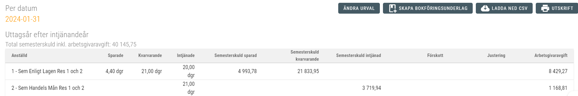 När man har gjort sina val klickar man längst ner till höger på knappen SKAPA. Då skapas en semesterskuld per valt datum och längst upp finns nu också ett val, SKAPA BOKFÖRINGSUNDERLAG. När man klickar på den skapas ett bokföringsunderlag i serien D följt av en siffra som motsvarar månadens siffra. För september heter bokföringsunderlaget 20XX.D.09. När bokföringsunderlaget är skapat hittar man det på samma ställe som bokföringsunderlagen för övrig lönekostnad under sidomenyn Lönekörning – Bokföringsunderlag. Eventuell export till bokföringsprogram görs på samma vis som övriga bokföringsunderlag. Förslagsvis bokför man semesterskulden varje månad för att alltid ha en aktuell semesterskuld. Första månaden skapas ett bokföringsunderlag som har motsvarande belopp som man ser på semesterskuldsrapporten på det bokföringskonto som är valt i företagsinställningar och med den fördelning på resultatenheter man eventuellt har valt. I det här exempelföretaget bokfördes semesterskulden första gången i januari. Vi valde att inte ta med resultatenheterna då. Då såg semesterskuld och bokföringsunderlaget för semesterskulden ut så här för två av de anställda: