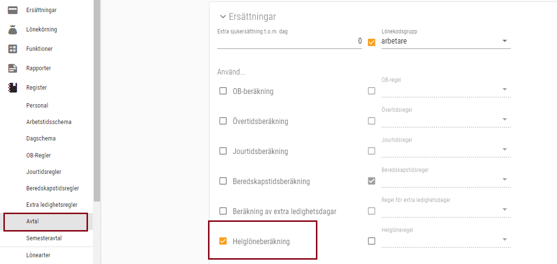 Börja med att gå till sidomenyn Register och välj Avtal. Ta fram eller skapa ett avtal för anställda som är berättigade till helglön. Under menyvalet Ersättningar finns en rubrik som heter Helglöneberäkning. Markera den och klicka på SPARA.