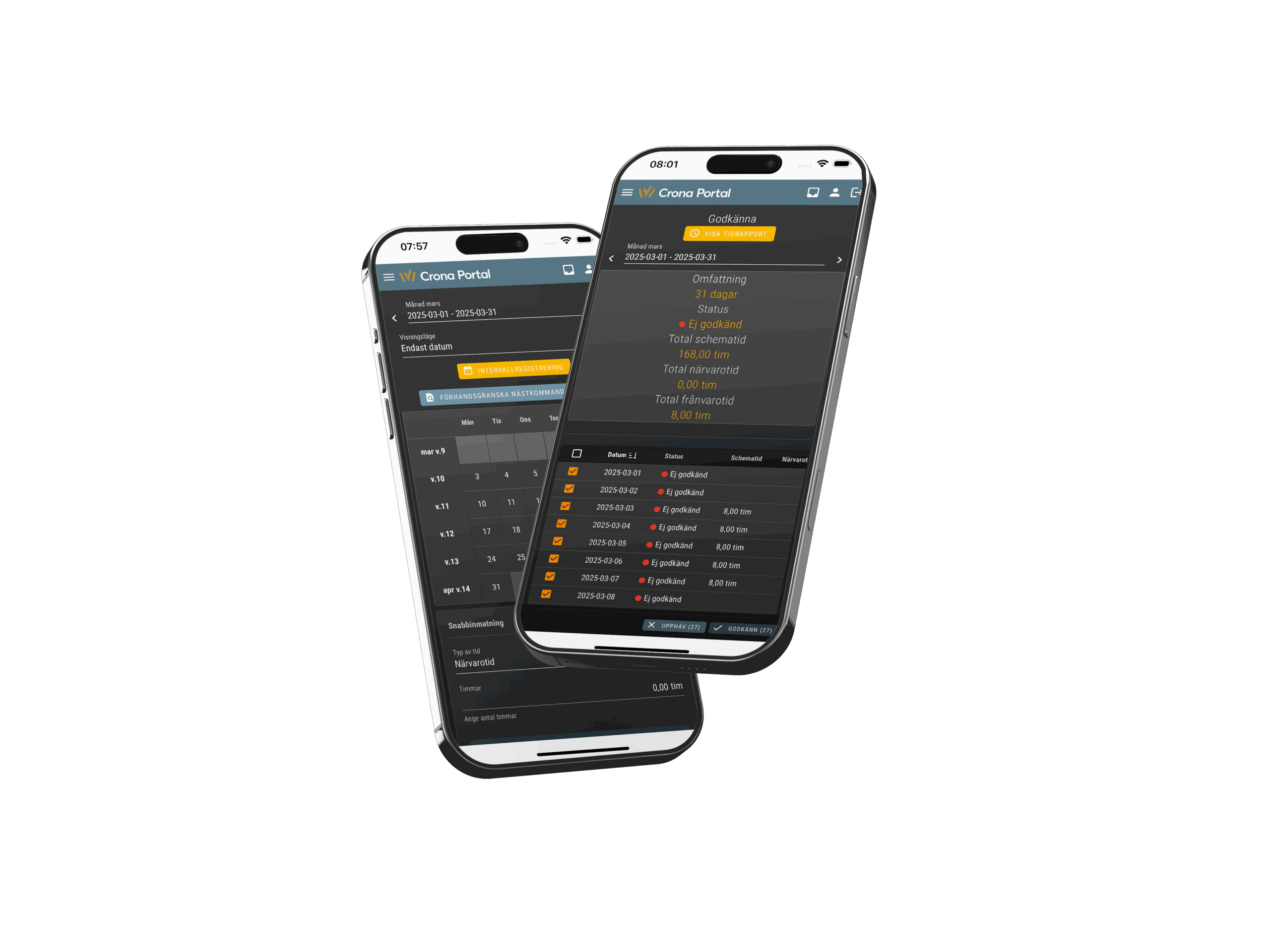 I Crona Portal sköter ni enkelt företagets tid och avvikelserapportering, anpassat efter era avtal och regler. Ni ställer in vilka medarbetare som ska ange tid eller vilka som bara ska avvikelserapportera. När tidrapporterna är klara attesteras det enligt era regler och förs sen automatiskt in i lön för vidare beredning.